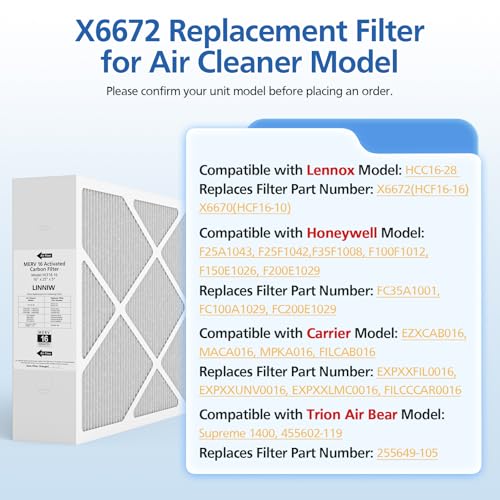 X6672 Filter Compatible Models: Our X6672 16x25x5 MERV 16 air filter is perfectly compatible with Lennox X6672 and Lennox HCC16-28 Healthy Climate Carbon Clean Merv 16 Furnace HVAC System, Part Number HCF16-16, HCF16-10; Compatible with Honeywell model: F25A1043, F25F1042, F35F1008, F100F1012, F150E1026, F200E1029, Part Number FC35A1001, FC100A1029, FC200E1029; Compatible with Carrier model: EZXCAB016, MACA016, MPKA016, FILCAB016, Part Number EXPXXFIL0016, EXPXXUNV0016, EXPXXLMC0016, FILCCCAR0016; Compatible with Trion Air Bear model Supreme 1400, 455602-119, Part Number 255649-105.