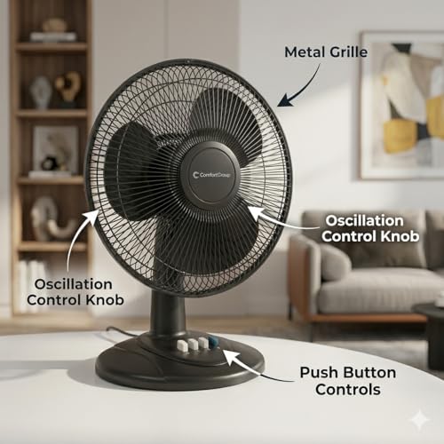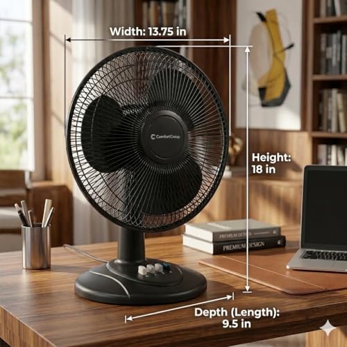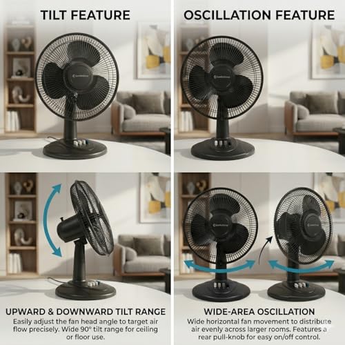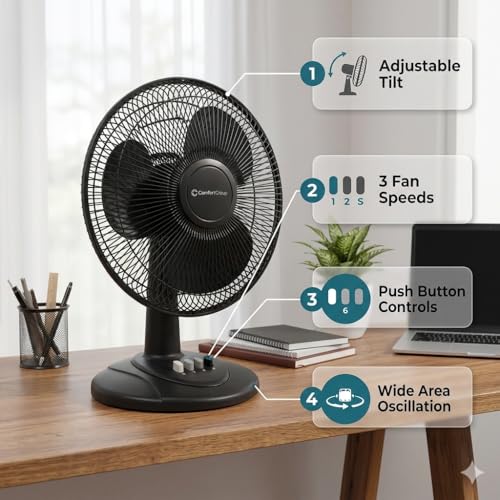 Specification: Comfort Zone Oscillating Table Fan with Adjustable Tilt, Convenient Push Button Controls, Quiet, 12 inch, 3 Speed, Desk Fan, Airflow 7.25 ft/sec, Ideal for Home, Bedroom, Dorm & Office, CZ121BK