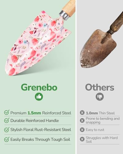 Unique Floral Design: Grenebo gardening set features a beautifully designed floral pattern, combining stylish design with practical durability. Crafted with premium materials, these gardening tools are made to last for years, offering both aesthetic appeal and reliable performance in your garden, patio, or balcony.