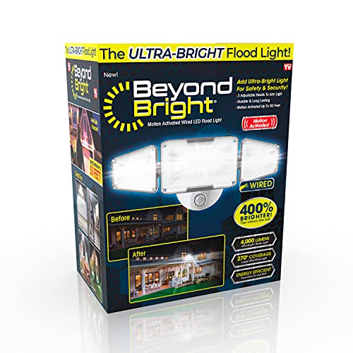 Ontel Beyond Bright Motion Activated Wired LED Flood Light – Ultra-Bright, Weather-Resistant Light with 3 Adjustable Heads – Maximum Security for Porch, Deck, Yard & More