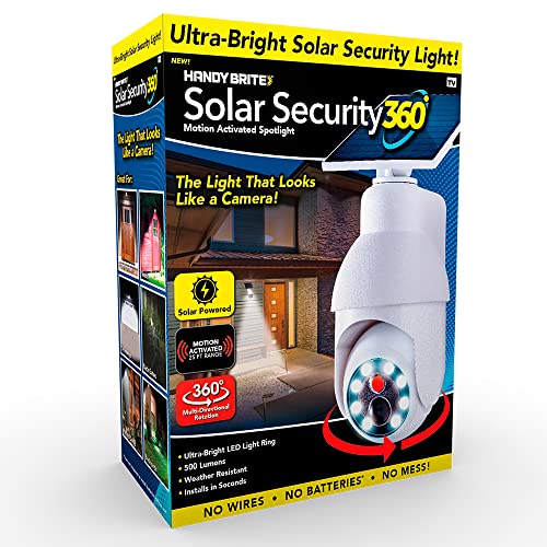Simple Home Security Setting up home cameras is no easy feat – you need additional infrastructure and regular maintenance. With Ontel Handy Brite Solar Security 360, you get security instantly! And, it is much easier to set up. This solar security light is shaped like a camera to deter intruders. Features 8 LED bulbs that light up instantly producing 500 lumens of brightness and a motion detection range of up to 25 feet, enough to cover your doorways, driveways, decks, backyards, sheds, walkways, and more. Quick and Easy Setup Setting up this home security LED light is very simple. Just peel back the protective plastic and stick it to any surface, and you are good to go! The solar LED light is weather resistant, so you don’t need to fret about rough weather. Its powerful lithium-ion battery charges via the solar panel during the day, thus eliminating the need to worry about replacing batteries or running a wire to a socket.