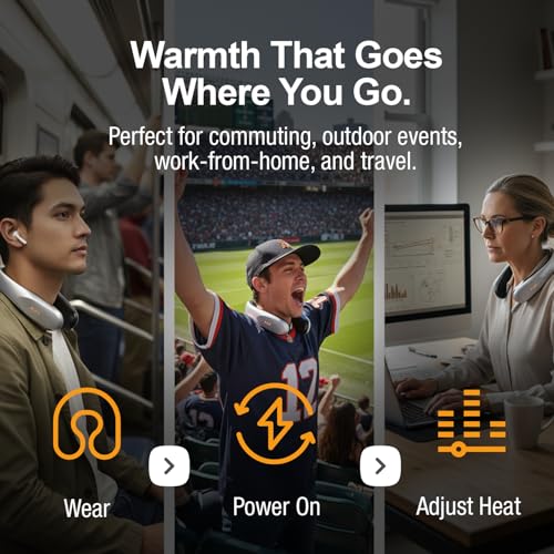Four Customizable Heat Settings: Adjust the temperature to your needs with 4 heat settings. This neck heater portable rechargeable is perfect for various winter activities like sports events, camping, or office use. It’s a small, lightweight solution for warmth without bulk.