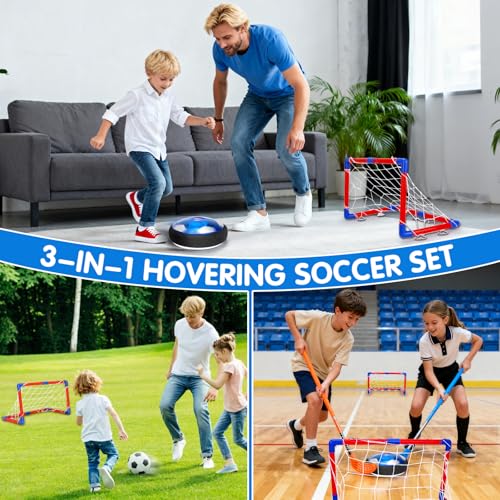3 in 1 Hover Hockey Soccer Set: The kids toy set includes 1 hover hockey ball, 1 hover soccer ball (both are not included batteries), 2 soccer goals and nets, 2 hockey sticks, 1 inflatable soccer, pump and screwdriver for installation. Multiple ways to play, great juguetes para niños, kids sports toys, perfect 4 5 6 7 8 9 year old boy birthday gifts,juegos para niños.