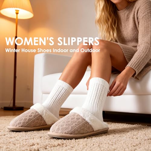 Women’s Cozy Knit Slippers with Faux Fur Lining Memory Foam – Non-Slip Rubber Sole Indoor/Outdoor Winter House Shoes for Warmth and Comfort